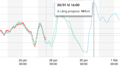 Ett exempel är Skanör som redan drabbats hårt av sanderosion. Enligt SMHI blir det den 28 januari kl 10.00 79 cm och den 30 januari kl 16.00 101 cm över normal havsnivå. Deras havsnivåprognoser är mycket träffsäkra, så räkna med att det blir de här nivåerna.