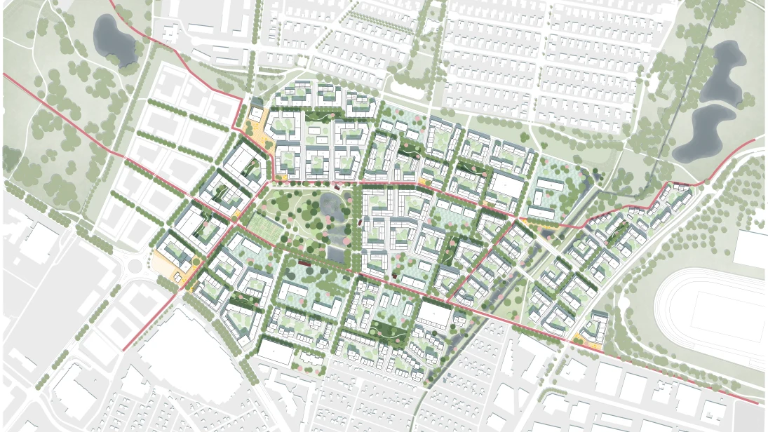 Stadsbyggnadsidén fokuserar på tre stråk som knyter samman stadsdelen med omkringliggande områden, och som möts i en stor central park. Ett urbant stråk blir stadsdelens kommersiella tyngdpunkt med handel, service, bazaarer och loppisar. Urbana byar med myllrande gränder och grönska möjliggör för möten och lokal gemenskap.