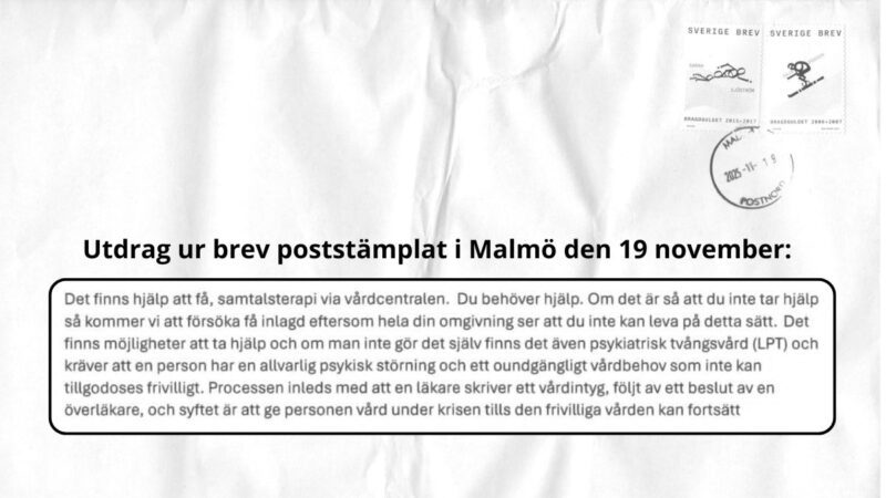 Avsändaren utger sig för att vara en vän som är orolig. ”Detta skriver vi till dig för att vi ser att du inte mår bra,” inleds brevet. Det fortsätter med att beskriva källan som ”nedtryckt, hånad och ifrågasatt”.