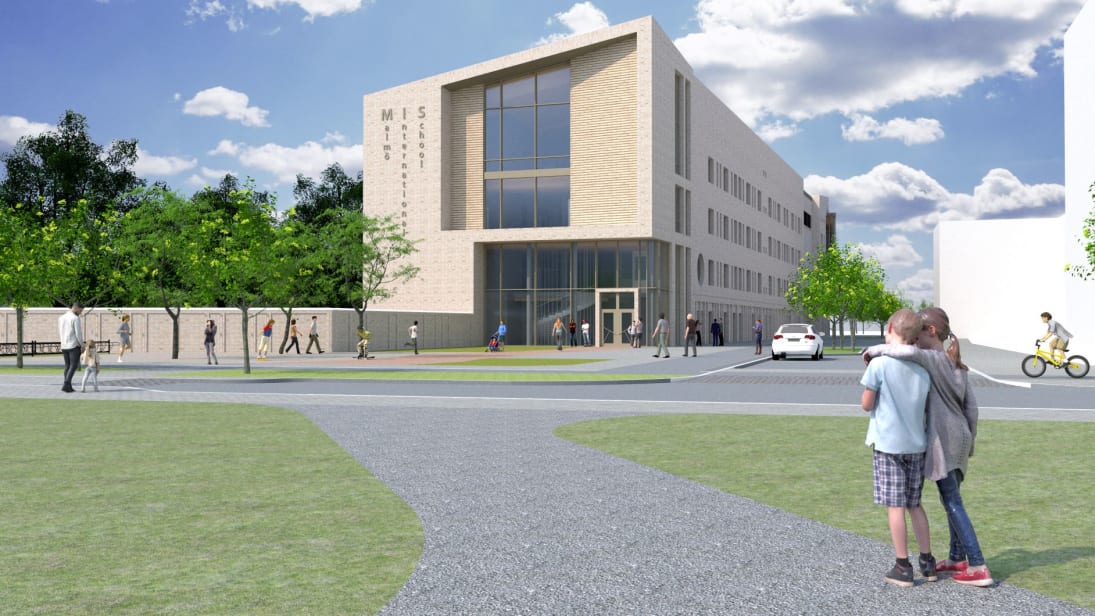 Nya Malmö Internationella skola blir fyra våningar hög med en gul fasad i så kallat danskt slaget tegel. Utemiljön formas som grönskande rum för olika funktioner med bland annat utegym, bollsport och lek. Skolan beräknas stå klar sommaren 2024. Illustrationsbild från New Line Arkitekter