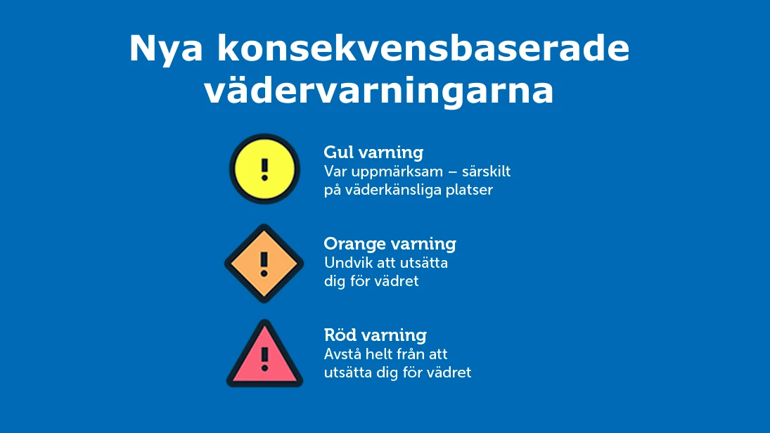 Vädret påverkar oss alla på olika sätt, varje dag. Extremt väder kan innebära mycket stora påfrestningar på samhället, men konsekvenserna av vädret kan skilja väsentligt beroende på var i landet, eller under vilken årstid, det inträffar. I oktober 2021 gick SMHI över till ett förnyat vädervarningssystem med konsekvensbaserade varningar.