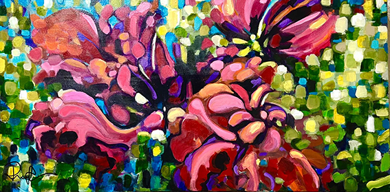 Nyköpingskonstnären Rosamy Cotino målar frodiga motiv i akryl med i grunden i en organisk expressionism. Hon ser sina målningar som fönster till en dimension av reflektion, fantasi och manifestation. Motiven rör sig ledigt i intervallet mellan det figurativa och semi abstrakta och hon strävar efter att vara djärv och avsiktlig i färger och linjer.