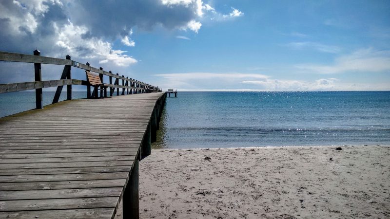 Vacker kritvit sandstrand med badhytter byggda i gemensam stil. Stranden kan var svår att nå med bil, så att gå eller cykla dit är att rekommendera. Vattnet är mycket långgrunt, men det finns en brygga i anslutning till stranden.