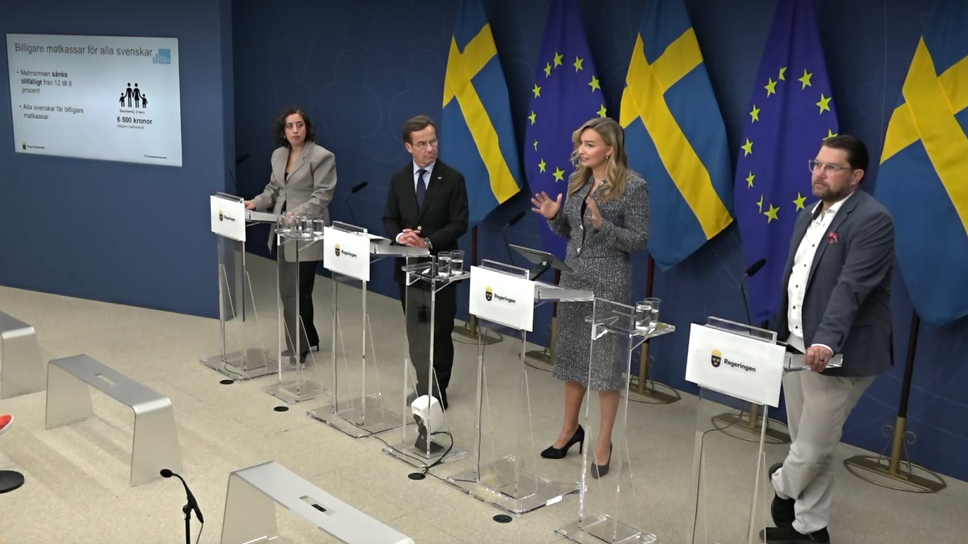 | Tidöpartierna | Tillfällig sänkning av matmoms (12% till 6%) | Matpriskommission, regelförenkling, konkurrensfrämjande |