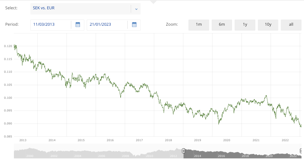 Men det finns en annan faktor som smyger sig på lite långsammare och det är den svaga svenska kronan. Den hoppar lite upp och ner, men på lång sikt är den katastrofalt dålig. På tio år har exempelvis svenska kronan tappat drygt 26% mot euron.