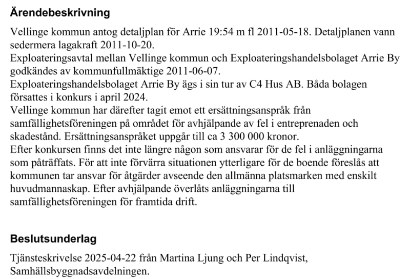 Enligt beslutet ska kostnaderna för att åtgärda bristerna finansieras av kommunen, upp till ett belopp som resultatfördes under 2024. Samtidigt är kommunen mycket tydlig med att inget skadestånd kommer att betalas ut till samfällighetsföreningen. Detta innebär att de boende, som krävt ersättning på nästan 3,3 miljoner kronor för fel, underhåll och juridiska kostnader, inte kommer att kompenseras för de utlägg de redan haft i tvisten.