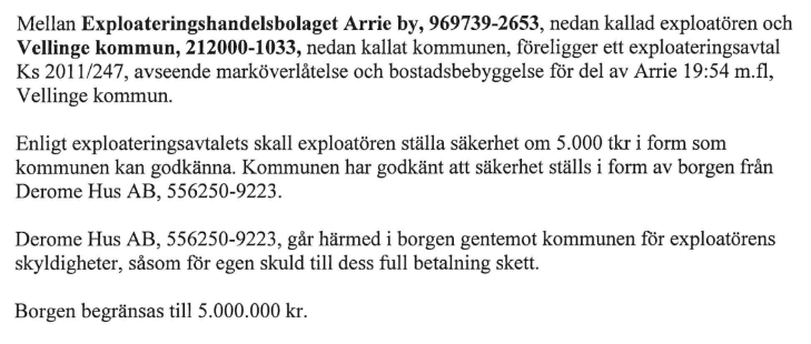 Ett exploateringsavtal tecknades den 10 januari 2012 mellan Vellinge kommun och Exploateringshandelsbolaget Arrie by, senare C4 Hus, för att bygga 28 småhus i Arrie. För att säkra projektets fullgörande ställde moderbolaget Derome Bostad AB ut en proprieborgen på fem miljoner kronor, en garanti som skulle täcka exploatörens åtaganden om de inte fullföljdes.