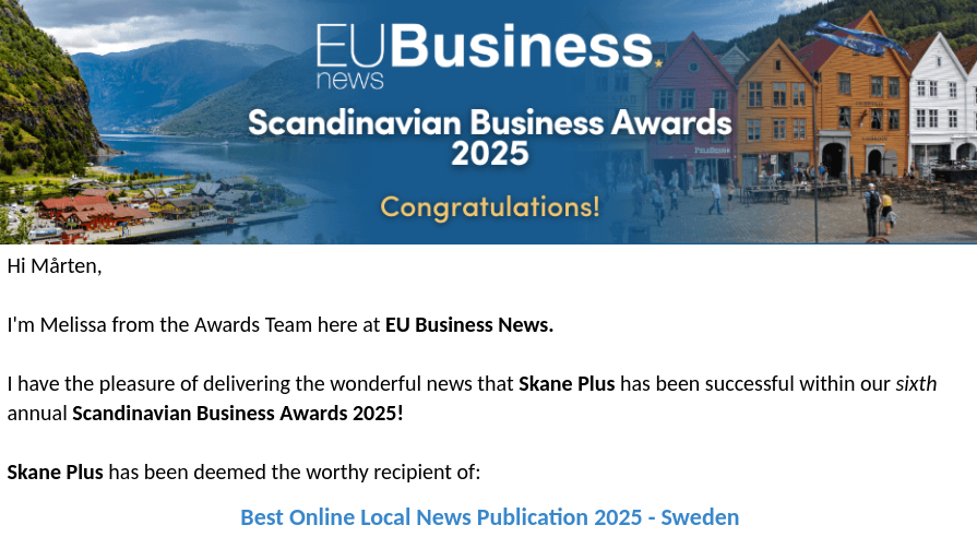 Magasinet EU Business News har utsett Skåne Plus till ”Best Online Local News Publication 2025 in Sweden”. Vi på Skåne Plus är givetvis stolta över utmärkelsen och ser det som ett bevis på rätt fokus och engagemang att förmedla positiva lokala nyheter i Skåne. Vårt mål är och har alltid varit att förse våra läsare med en trevlig mix av positiva nyheter, evenemang och besöksmål i underbara Skåne.